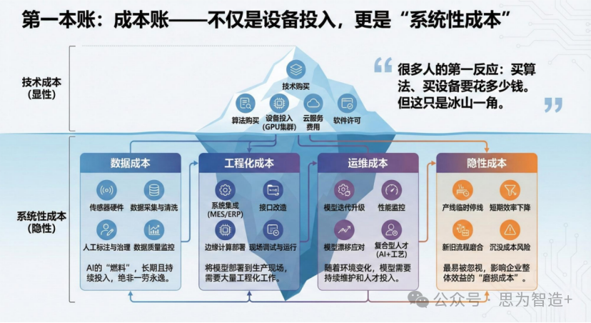 这部分最容易被忽视,也最致命。比如,为了配合数据采集或模型测试,产线可能需要临时停线;新旧流程的磨合期,可能会导致短期效率下降;如果试点项目最终失败,前期的所有投入都可能成为沉没成本 。这些“磨损成本”虽不直接体现在采购清单上,却实实在在地影响着企业的整体效益。