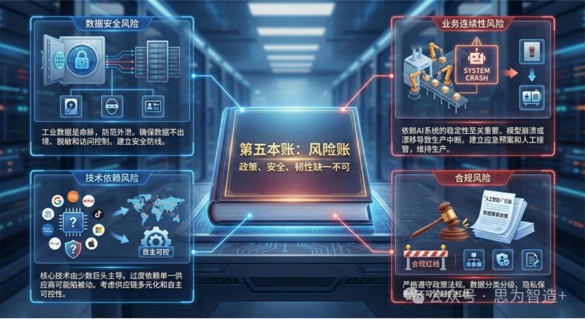 这里的“算账”,不是简单的财务核算,而是一次对企业现状与未来的全面盘点。在AI这趟昂贵的“购物之旅”开始前,我们必须冷静下来,清晰、透彻地算清五本大账: 成本账、收益账、数据账、组织账、风险账 。这五本账,构成了工厂AI转型的“家底”,决定了你的“人工智能+”之路能走多远、多稳。