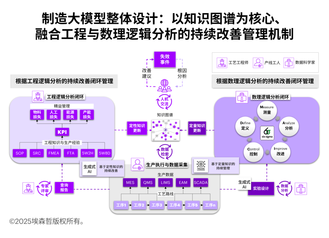 以知识图谱作为“人、生成式AI和AI”间的通用语言,表达财务目标、KPI与工程知识间的逻辑关系,并构建生产业财一体化管理闭环,以“零损失”为终极目标,推动生产运营的持续改善;