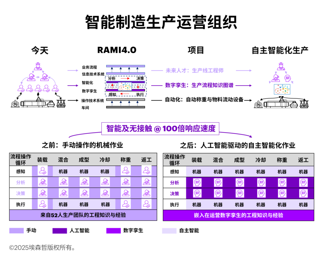 过去8年,埃森哲团队在工业4.0参考架构的指引下,通过理论研究与实战探索,利用运营数字孪生(工业互联网+知识图谱)与AI技术,让传统自动化产线实现了自适应生产能力,提高了生产质量的同时,削减了物料、人工、能源和产能损失。