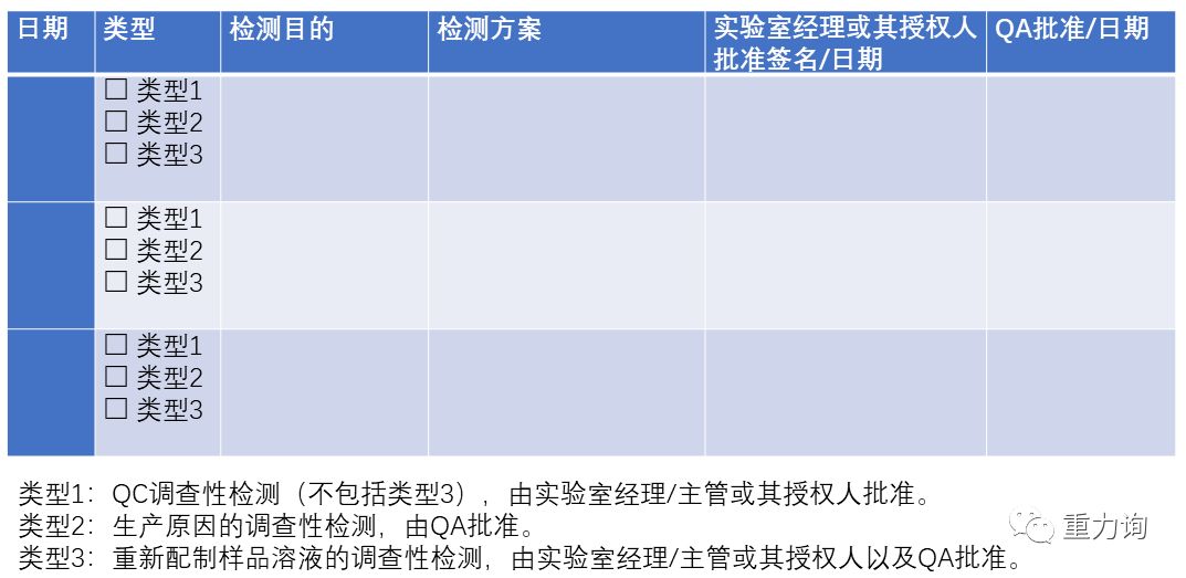 怎么记录调查性检测的方案和批准过程?我的做法是,在OOS SOP中,要求每个OOS调查记录,加入下面一个表格: