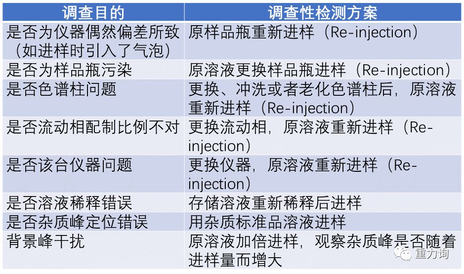 调查性检测(investigative testing),例如原溶液的重新进样(re-injection)