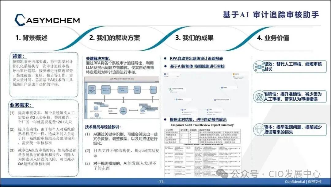 按照凯莱英内部要求,每年需要对计算机化系统执行一次审计追踪审核,导出审计追踪,按要求进行筛选审查,整理截图,复核、报告等工作,需要大量时间,急需基于 AI技术的工具帮助用户完成自动化的审核。所以我们通过 RPA将各个系统审计追踪导出,利用 LLM及提示词建立智能体,使其自动按照特定规则对审计追踪进行审核。