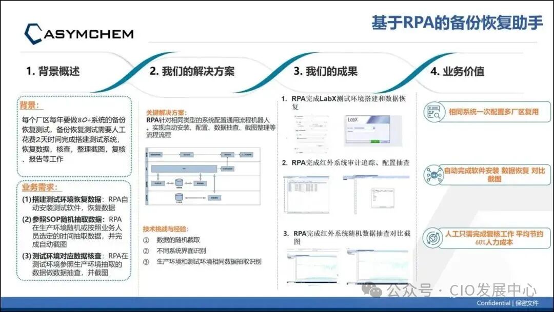 所以我们通过机器人,让机器人配置安装好每一个系统, RPA针对相同类型的系统配置通用流程机器人。实现自动安装、配置、数据抽查、截图整理等流程。实现通过 RPA完成 LabX测试环境搭建和数据恢复,完成红外系统审计追踪、配置抽查,完成红外系统随机数据抽查对比截图。最终可在一个厂区节省 102个人/天。