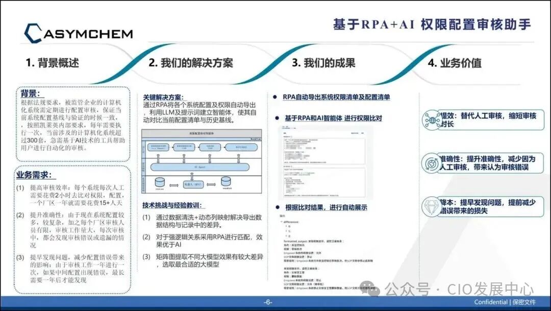 通过系统,我们现在做系统权限的检查,大概需要两个小时,一个厂区大概需要 15天,我们通过 RPA技术,把每一个系统的相关配置导出,用 AI、大语言模型,通过提示词做自动对比,看结果是否可以接受。当然我们会在系统中提前置入相应的权限和配置,判断是否与 SOP中的相符,最终通过大语言模型加工作流输出结果。对于一些权限风险,也会在输出时做人工提示。